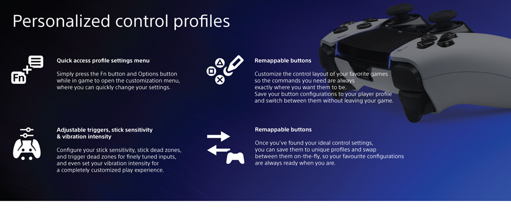 Get an edge in gameplay by creating your own custom controls to fit your playstyle. Built with high performance and personalization in mind, the DualSense Edge™ wireless controller invites you to craft your own unique gaming experience so you can play your way. Ultra-Customizable Controls: Changeable stick caps, remappable inputs and custom settings make your DualSense Edge™ wireless controller uniquely yours. Fine tune your aim by adjusting stick sensitivity and dead zones, set the travel distance of your triggers for faster inputs, and quickly swap between control profiles so you’re always ready for your next game. Mappable Back Buttons: Swappable back buttons can be configured to any other button input, so you’ve always got game-changing actions and essential controls at your fingertips. Plus, with two different styles of button to choose from, you can pick an input type that feels just right for your playstyle. DualSense™ Wireless Controller Features Built In: Enjoy all the immersive features of the DualSense™ wireless controller and our signature controller comfort. Experience varying force and tension at your fingertips with adaptive triggers and feel your in-game actions and environment simulated through haptic feedback. Replaceable Stick Modules: Play for longer with swappable replacement stick modules available to purchase separately. Haptic feedback and adaptive trigger features available when supported by game.
