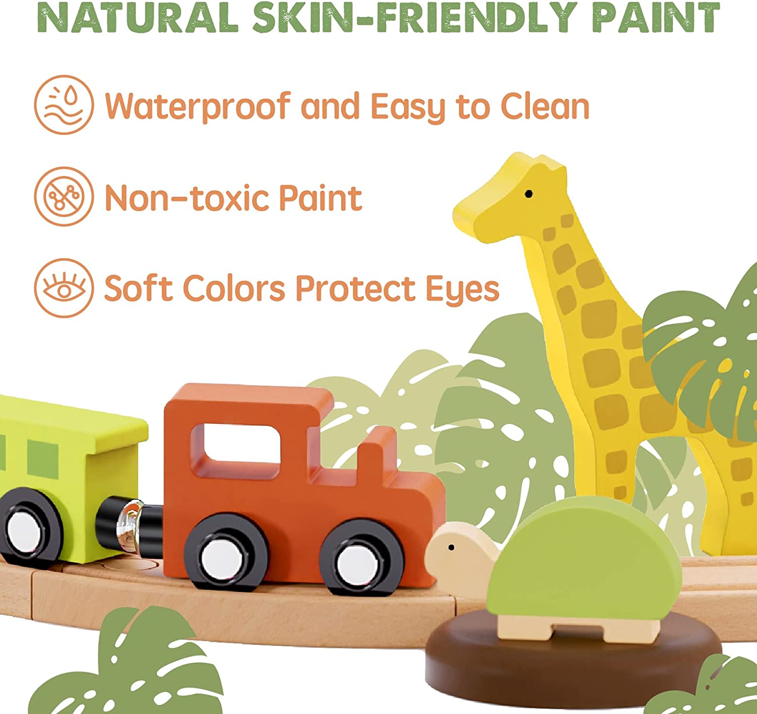 ?Premium Wood Craftsmanship: These train toys are made with beech wood, sturdier than pine, and feature hand-sanded edges to protect children better during play. The perfect sizes of toddler train set for little hands to hold and grab, with no choking hazards. Lead-Free & BPA- Free & Phthalates Free. Meets the European, American, and Australian safety Standards EN71, ASTM F963, and AS/NZS ISO 8124.