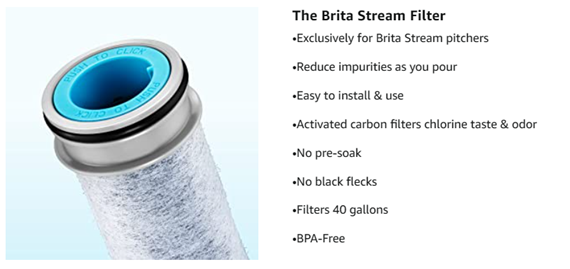 BPA-free Brita Stream Replacement Filters are made with Filter-As-You-Pour technology so you can get filtered water 10X faster compared to the market leading pitcher system. Made with proprietary dual-layer filtration technology and containing activated carbon to reduce chlorine taste and odor., These filters deliver great-tasting water and maintain a healthy level of fluoride, an additive in water that promotes strong teeth (applies to fluoridated municipal tap water). The filters have an easy-hold grip and click button for simple insertion and removal. Change these filters every 40 gallons, about 2 months for the average family, for best performance. The innovative carbon form means no black flecks. One Stream filter can replace 300 standard 16.9 ounce water bottles. Drink cleaner, great-tasting water with Brita.