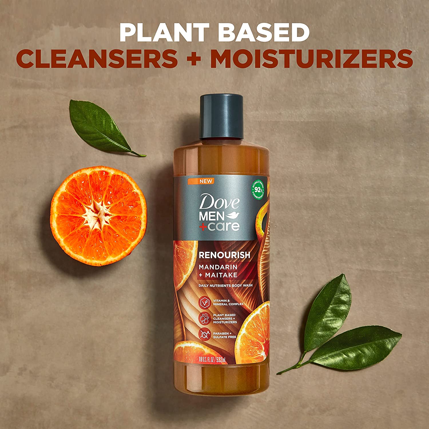 Renourish your skin with Dove Men+Care Renourish Mandarin + Maitake Body Wash, made with plant-based ingredients and nutrients for healthier, hydrated, and stronger skin.