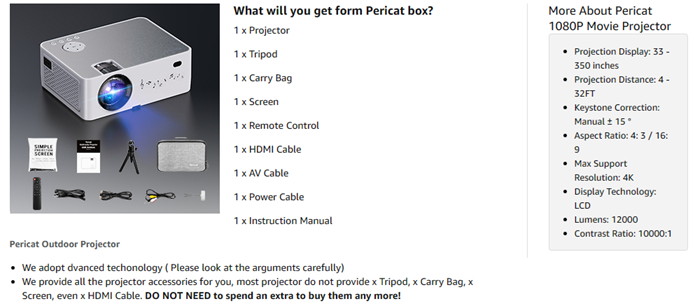 - 【Native 1080P & 4K Support 】Featured with 1920*1080 full HD resolution and 4K Support technology, Pericate Q9 video projector restores the true color of the picture without downscaling or compression, provides clear and high definition images to reduce eye irritation.