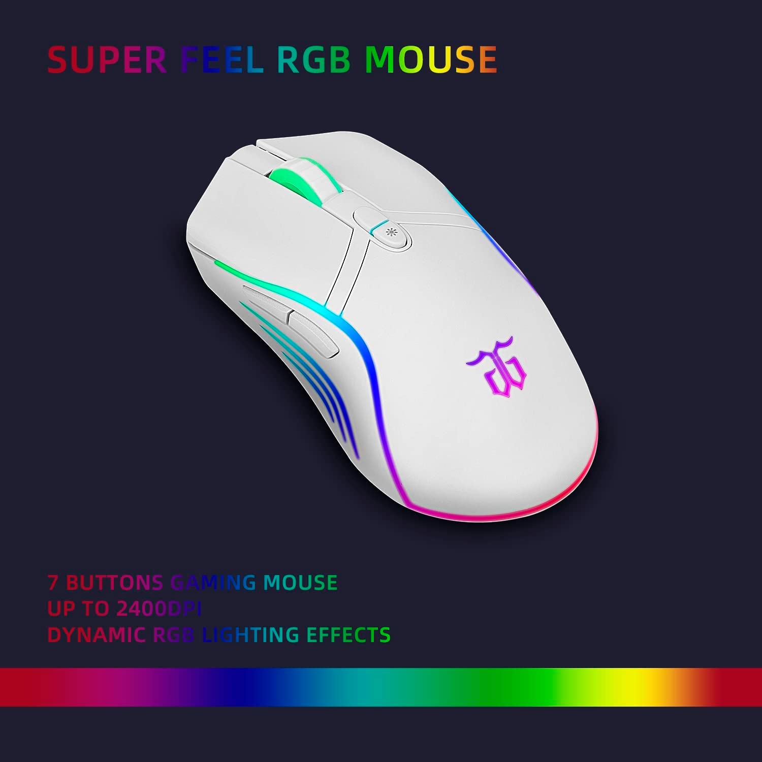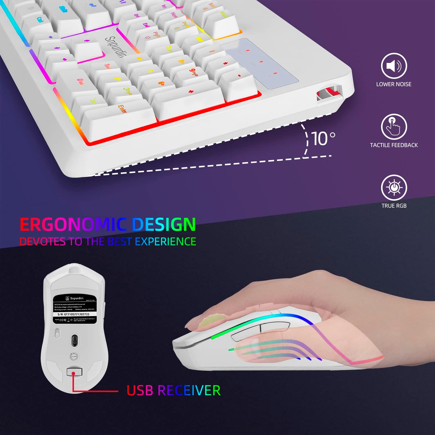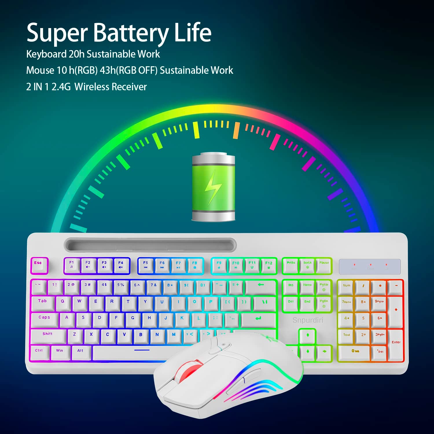 Wireless Gaming Keyboard and Mouse Combo,Snpurdiri True RGB Rechargeable Full Size Anti-ghosting Keyboard with Tablet/Phone Bracket, RGB Mouse,Long Battery Life for Gaming, Office(White)