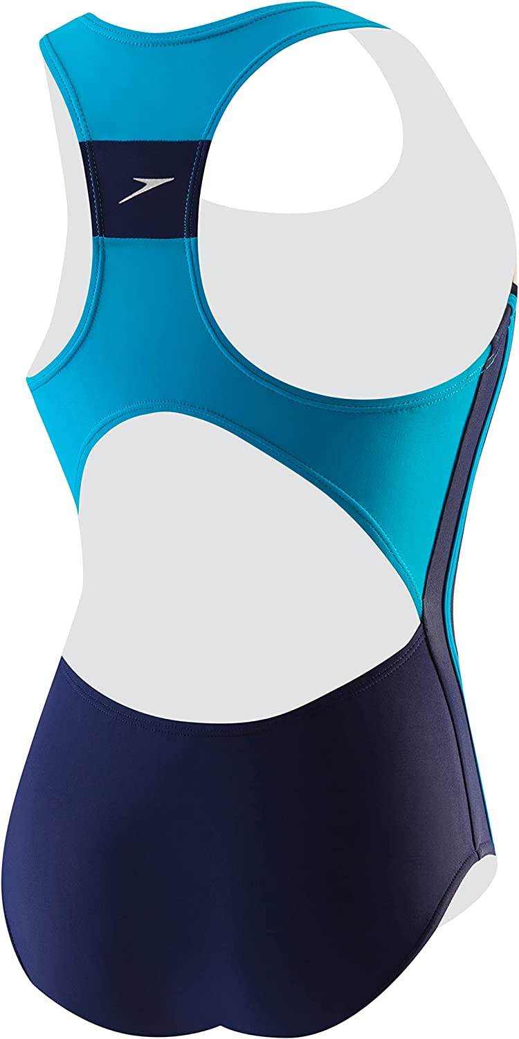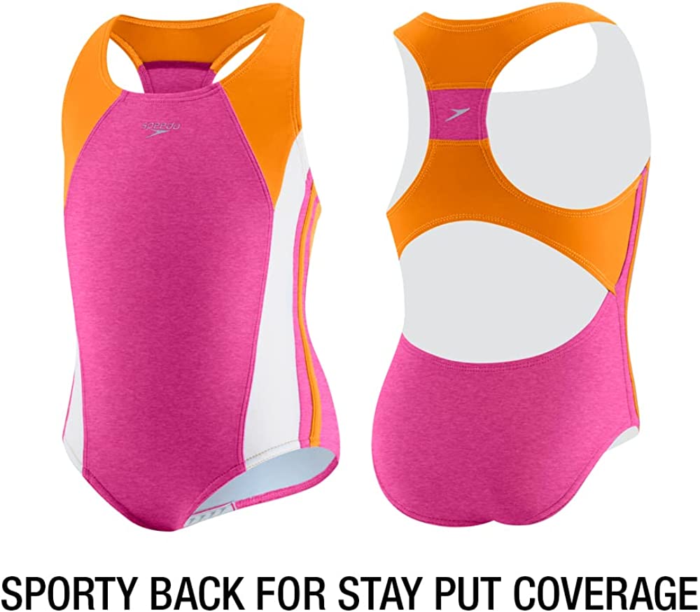 Speedo Boy's Size Charts Speedo Girl's Size Charts Swim laps around the competition in the Infinity Splice One-Piece Swimsuit. Xtra Life Lycra® Fiber: • Lightweight stretch fabric offers a wider range of motion in and out of the water.• Engineered to last over 200 hours in the pool.• Resists sagging, suntan lotion, oils, and chlorine. UV50+ Block the Burn protection from the sun's harmful UVA and UVB rays. Scoop neckline. Racerback design with cutout detail. No-Wedgie Worries offers silicone gripper at back legs for stay-put comfort. Moderate-rear coverage. 82% polyester, 18% spandex;Lining: 100% polyester. Hand wash, line dry. Imported. Measurements: One Piece Length: 19 in Product measurements were taken using size 8 Big Kids. Please note that measurements may vary by size. If you're not fully satisfied with your purchase, you are welcome to return any unworn and unwashed items with tags intact and original packaging included.