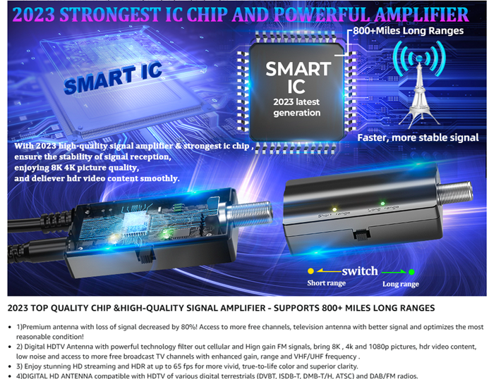 • ?▷【UPGRADED TO 800+ MILE LONG RANGE】- TV antenna for smart tv, equip with 2023 MOST POWERFUL built-in ic chip & HIGH-QUALITY signal amplifier, ensure the stability of signal reception,access to more free channels . Indoor/Outdoor tv antenna has high gain, bring clear pictures, low noise and access to most TV signals.Transfer 8k 4k combination of UHR and HDR video content. You deserved the 2023 Best & Oversized ANTENNA which offers more longer ranges on the market and lndustry-leading Power!