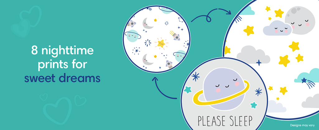• Sizes 3–7 overnight diapers are available in 8 nighttime prints