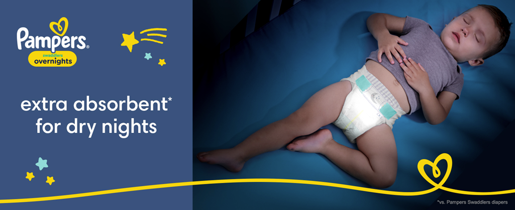 • Pampers Overnight Diapers help keep baby’s skin dry all night long with 50% more absorbent zones vs. ordinary diaper* (*Pampers Swaddlers Overnights vs. "every day of the year" brand)