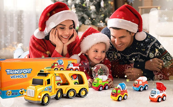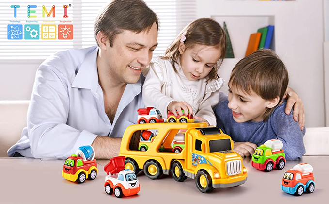 TEMI highly recommend this 5-in-1 Truck Toy Set for children's birthday / party / Christmas gifts, which allows your child to receive a big carrier truck and 4 of small public bus / taxi car / airplane at the same time. The colorful colors and cute cartoon expressions and patterns on the small vehicles will attract children very much and let them put it down.