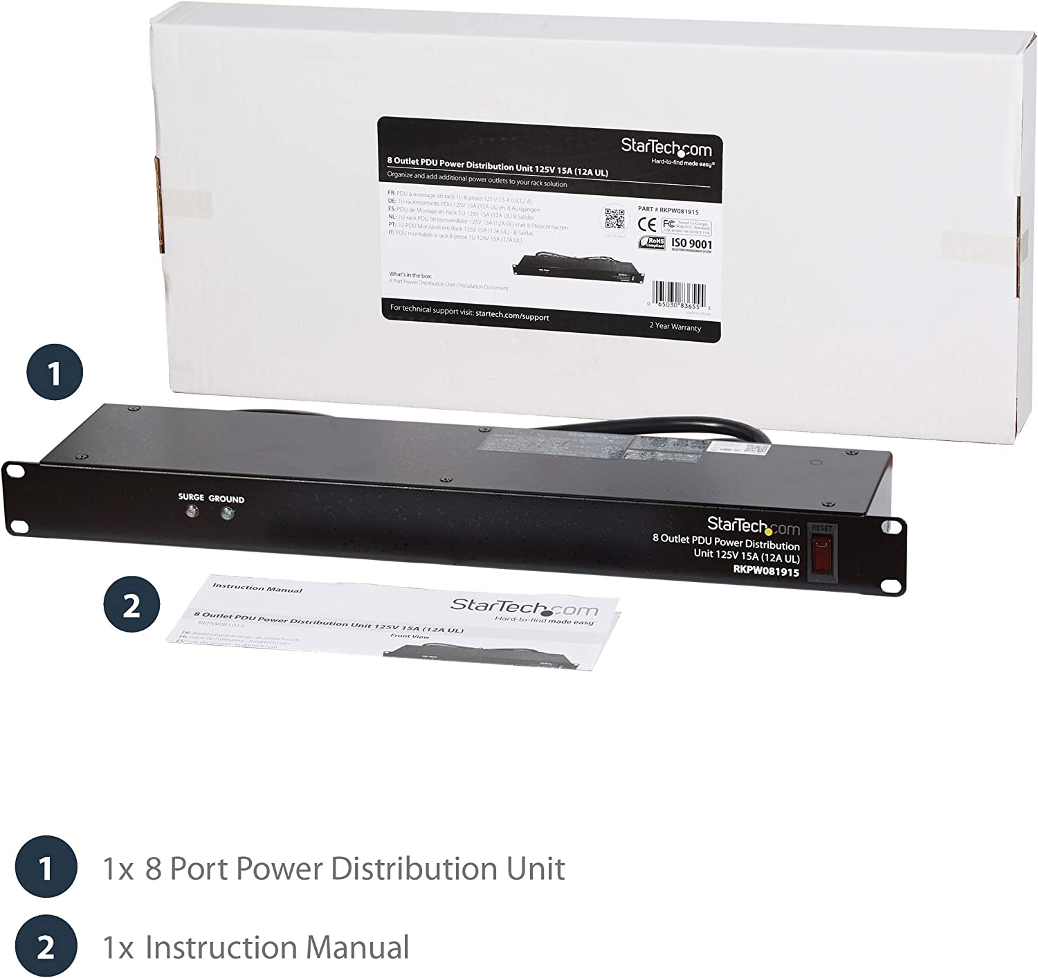 The Horizontal Rack Mount PDU delivers a cost-effective power distribution solution for your server rack or cabinet with 8-outlet (120V/15A). Hassle-Free Equipment Installation the 1U switched PDU strip can be mounted horizontally in any server rack 4 inches deep or greater, to supply eight 120V/15A power ports/outlets, and features a rugged steel casing to ensure maximum durability. Protects your equipment the front of the surge protector features two LEDs to indicate proper ground and surge detection while enabling you to control the power state with an illuminated power/reset switch. To prevent costly breakdowns of connected devices, the rack mount PDU features a built-in circuit breaker and reset switch, ensuring dependable performance of vital data center equipment. This unit is backed by a lifetime warranty with free technical support.