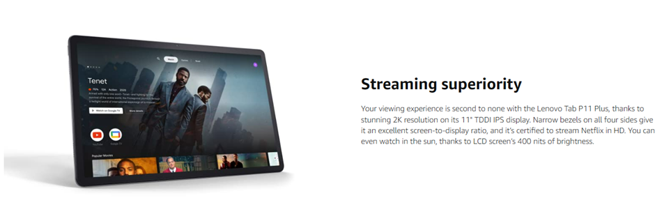 • Find a deeper connection with all the songs, stories, and shows you love with Dolby Atmos over four speakers on the Lenovo Tab P11 Plus