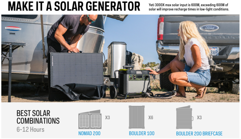 - RECHARGE WITH SOLAR: Maximize your solar input with Goal Zero’s MPPT (Maximum Power Point Tracking), which increases solar input by up to 30 percent. Turn your Yeti 3000X into a solar generator when you choose from our lightweight Nomad Solar Panels for portability, our durable Boulder series, or our Boulder installation models for semi-permanent or permanent installation.