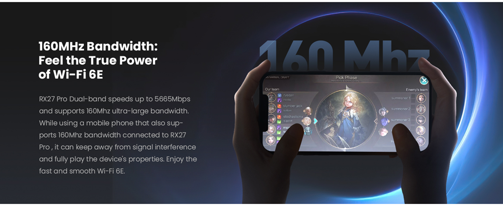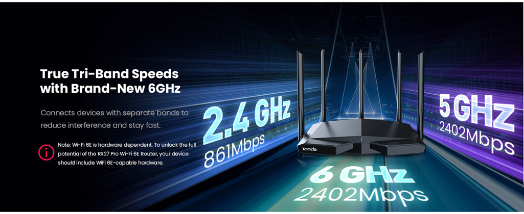• Note: Wi-Fi 6E is hardware dependent. To unlock the full potential of the RX27 Pro Wi-Fi 6E Router, your device should include WiFi 6E-capable hardware.