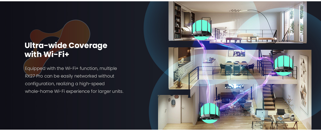 • Ultra-wide Coverage with Wi-Fi+:Equipped with the Wi-Fi+ function, multiple RX27 Pro can be easily networked without configuration, realizing a high-speed whole-home Wi-Fi experience for larger units.