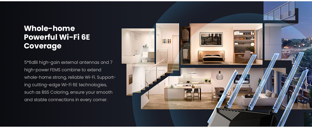 • Whole-home Powerful Wi-Fi 6E Coverage:5*6dBi high-gain external antennas and 7 high-power FEMS combine to extend whole-home strong, reliable Wi-Fi. Supporting cutting-edge Wi-Fi 6E technologies, such as BSS Coloring, ensure your smooth and stable connections in every corner.