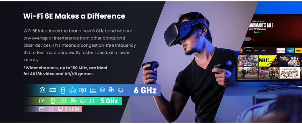 • Wi-Fi 6E Makes a Difference:More capacity in the 6 GHz band, which solves connection and congestion issues. Wider channels, up to 160 MHz, are ideal for 4K/8k video and AR/VR games.Less interference because only 6E-capable devices can use the band.