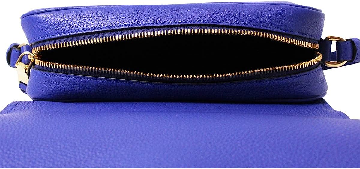 Color: Royal Blue. Material: Calf Leather. Gold-tone Hardware. Magnetic flap fastening. Zipper fastening. Interior black jacquard lining. One interior slip pocket.